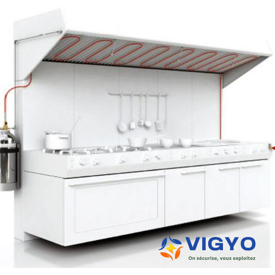 Dans les grandes cuisines ouvertes et les îlots de cuisson, des dispositifs d'extinction automatique adaptés au feu d'huile doivent être installés à l'aplomb des friteuses ouvertes.